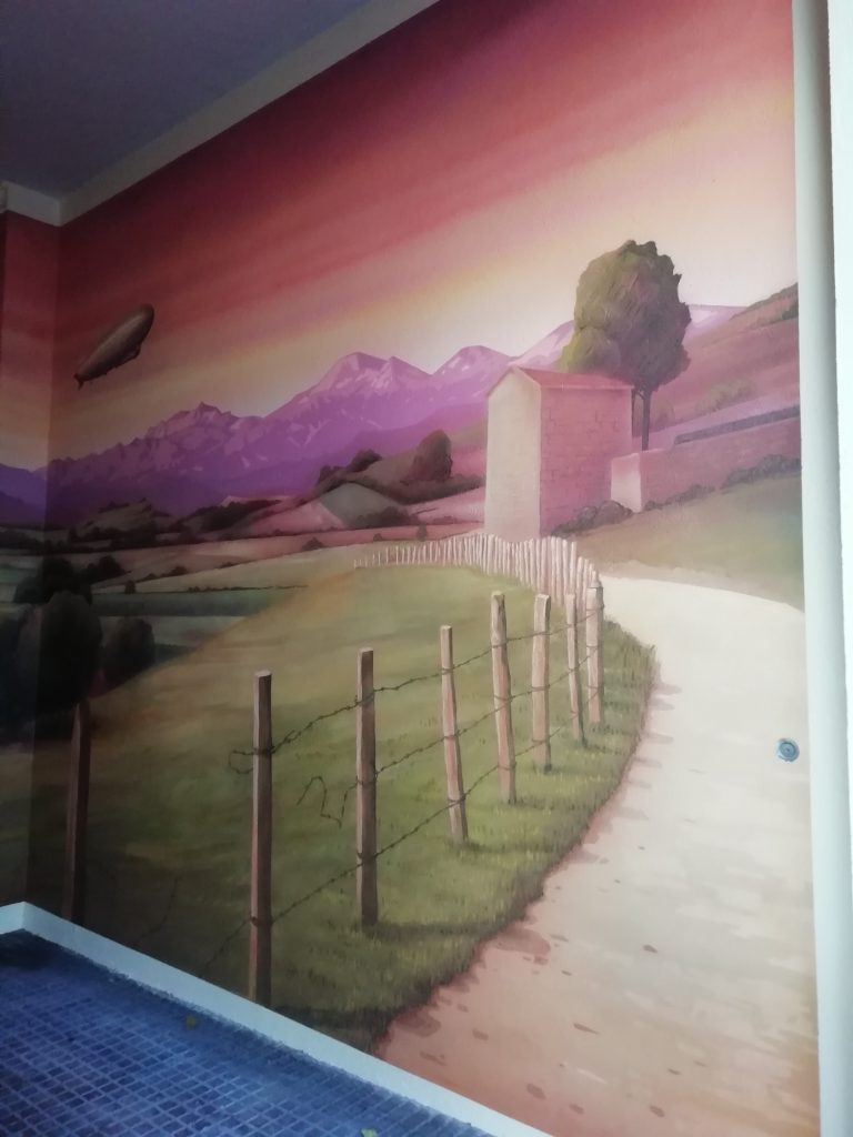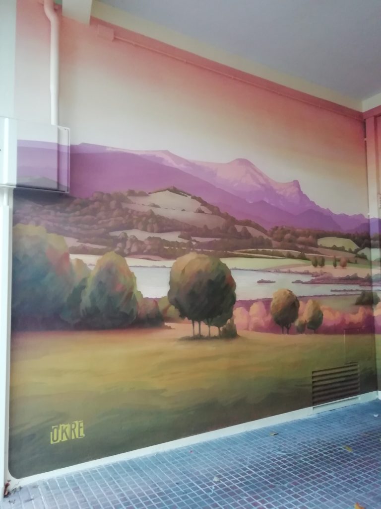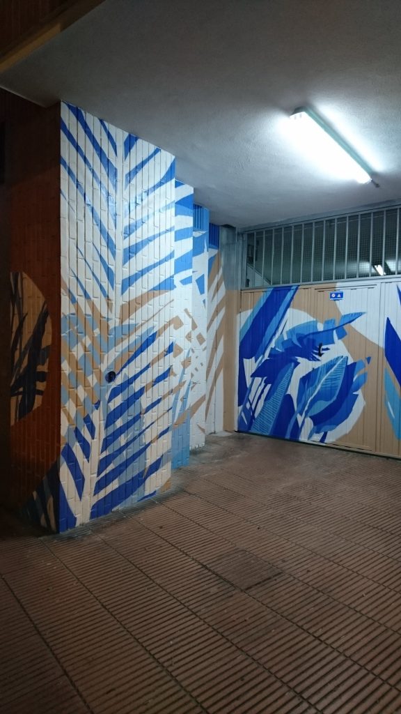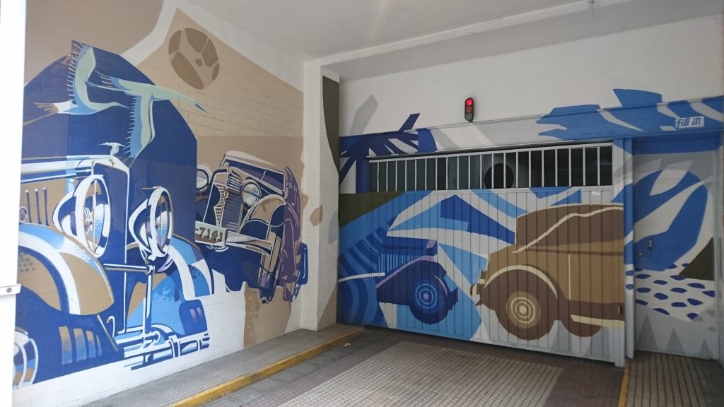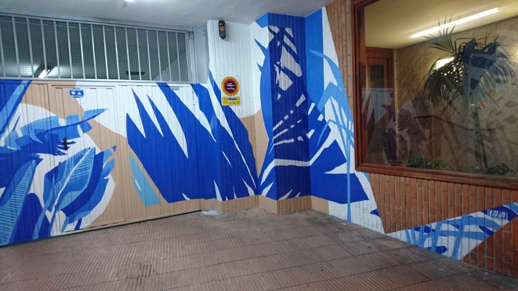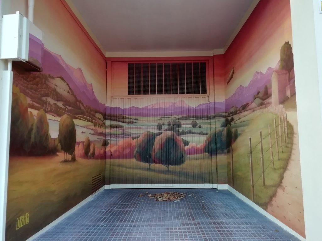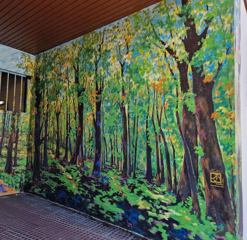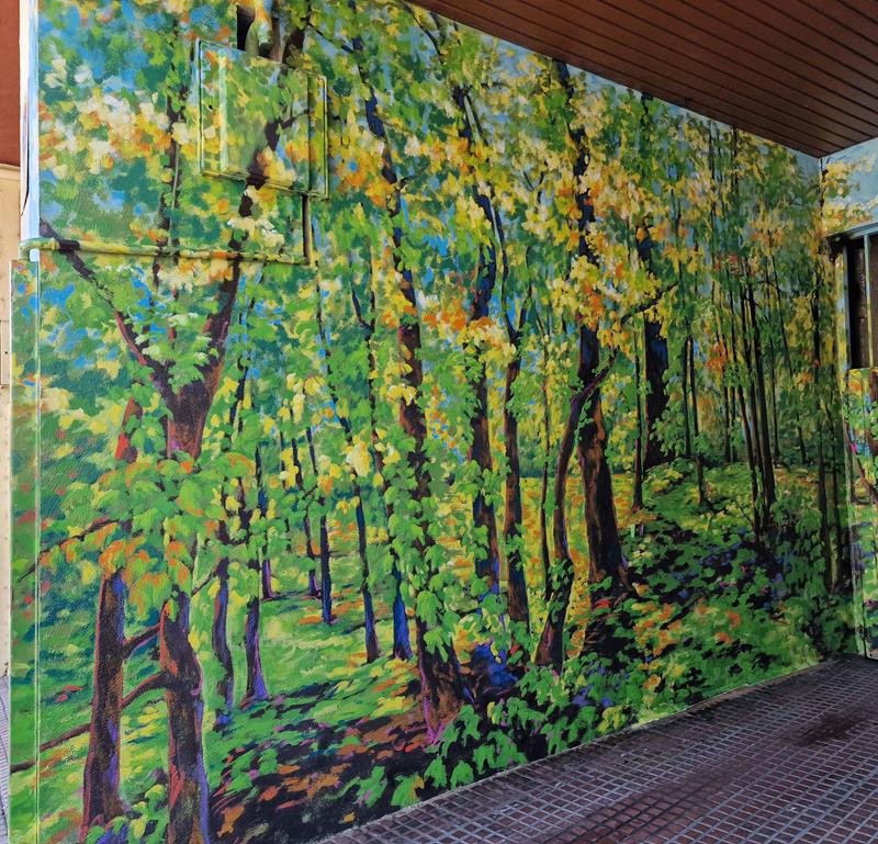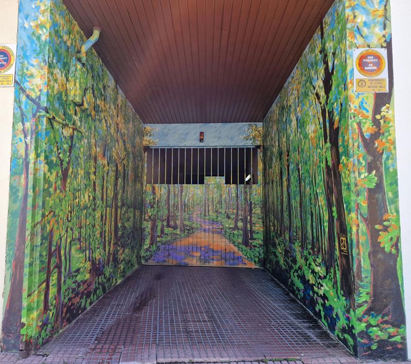 ADRIANO VI, 31. Edificio de la primera «concha de San Martín», en su garaje, a principios de 2024, «Decoración artística De Corn», ha pintado este «bosque» (fotos 5-3-2024):