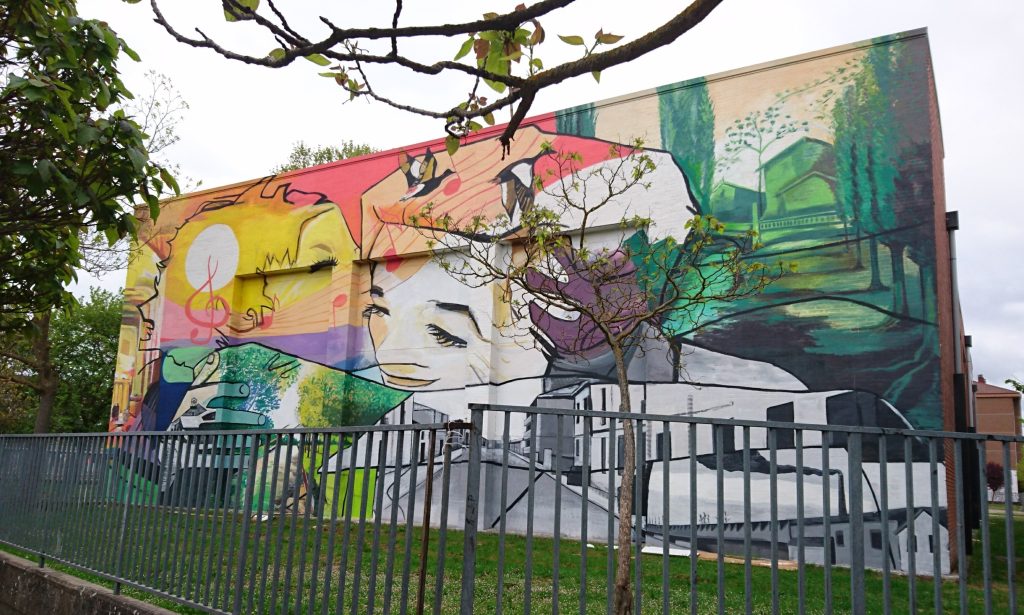 ADRIANO VI, S/N COLEGIO SAN MARTÍN. En los laterales de este colegio, en abril de 2019, Irantzu Lekue ha pintado un gran mural titulado «ONGI ETORRIA». Foto de 2-5-2019