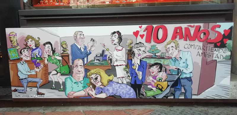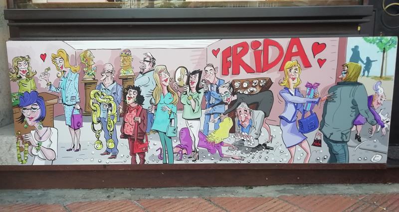 ADRIANO VI, 20.  La joyería FRIDA, en la esquina con la Avenida de Gasteiz, pintó en 2022 estas cucadas en la parte baja de sus escaparates, celebrando el X aniversario- Fotos hechas el 7-6-2022 (luego he visto que cierran en 2024, están de liquidación)