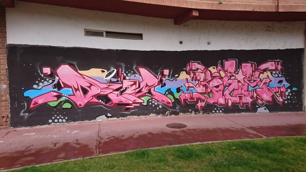 Este otro graffiti  está pintado en las paredes traseras del edificio 31, pero dan al parque de San Martín (sin nombre de calle), no a Adriano VI.  Foto realizada el 8-3-19. Laura, Omak, Lorea, Logan