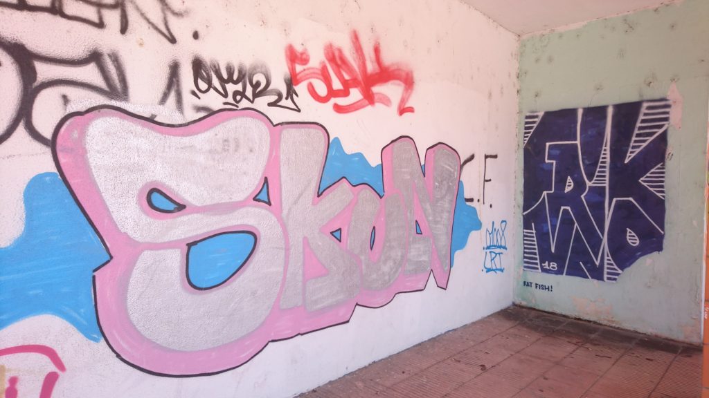 ADRIANO VI, 30. Dos graffitis en los pasadizos interiores. Fotos de  realizadas en junio de 2019. El de la derecha, pintado en 2018.
