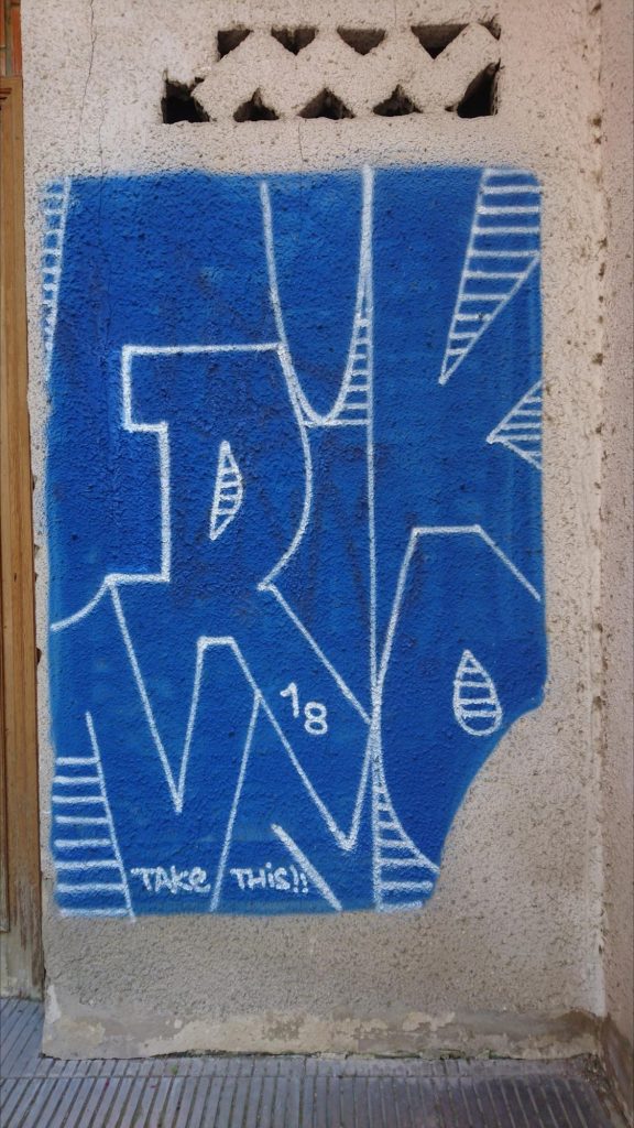 TOMÁS ALFARO,  9.  Parte izquierda. Foto de 9 de mayo de 2020. Esta pintada está realizada en 2018. Este marcador ya se está pasando mil pueblos poniendo su marca en todos los lados (además la pone con plantilla, vamos, que no se esfuerza mucho), es muy cansino. Hubo un tiempo que me gustaba ver este azul, ahora me da rabia verlos…están por todos los lados. TOMÁS ALFARO,  12 aprox.  Pertenece a la trasera de Pintor Vera-Fajardo, 12. Bar Gardens. Fotos de 13-3-2020. Mural realizado a principios del año 2020